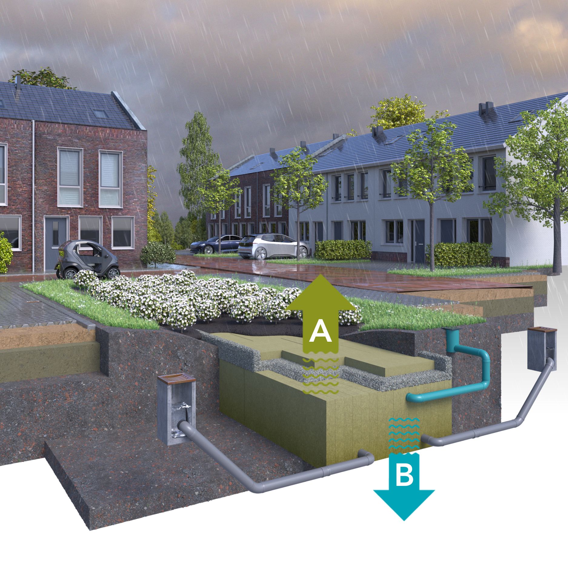 Het onderste Rockflow pakket (B) infiltreert het teveel aan afstromend regenwater komende vanaf de verharding naar de ondergrond. Hierdoor wordt de natuurlijke waterbalans hersteld en wordt wateroverlast op straat voorkomen. Dit deel van het systeem is ontworpen om zo snel mogelijk leeg – en daarmee beschikbaar - te zijn voor een volgende bui.